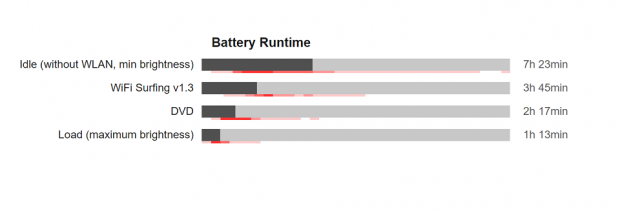 Với viên pin 2 Cell liền không thể tháo rời Lenovo ideapad 510 cho thời lượng sử dụng lên đến 7h23 phút với các tác vụ nhẹ, và tắt wifi, giảm độ sáng màn hình và chỉ sử dụng lướt web xem video nhẹ máy sử dụng được khoảng hơn 3h đồng hồ. còn mở full độ sáng màn hình và sử dụng các tác vụ cần xử lý đồ họa như chơi game, máy chỉ sử dụng được 1h13 phút.