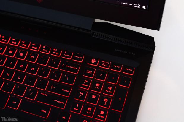 Phần tiếp giáp với bản lề mỗi cạnh bên cũng lấy ý tưởng từ họng xả của động cơ phản lực. Nếu lướt sơ, bạn dễ nhầm tưởng đây là khe tản nhiệt, vị trí để lấy không khí vào làm mát các linh kiện phần cứng bên trong. Tuy nhiên nó chỉ mang tính trang trí và góp phần thể hiện sự hấp dẫn của mẫu laptop chuyên game. Khu vực quanh bàn phím và vùng kê tay lại sử dụng chất liệu hợp kim nhôm để hạn chế bụi bẩn và bám dấu vân tay. Hệ thống bản lề chắc chắn hơn so với phiên bản cũ nên màn hình ít bị rung hơn trong quá trình sử dụng.