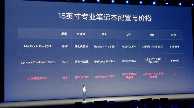 Mi NoteBook Pro sẽ dùng CPU Intel thế hệ thứ 8, phiên bản hiệu năng cao với 4 nhân xử lý (có vẻ như là Kaby Lake dòng H), dùng chip đồ họa nVidia GeForce MX150. MX150 là con chip đồ họa mới của nVidia để thay thế cho 940MX xuất hiện quá nhiều trên các máy tính trước kia, theo nVidia thì nó mạnh hơn khoảng 4 lần so với card đồ họa tích hợp HD520 của Intel, khoảng 25% so với GeForce 940MX. MX150 còn được mọi người gọi với tên GeForce GT 1030 để dễ so sánh với các phiên bản khác.