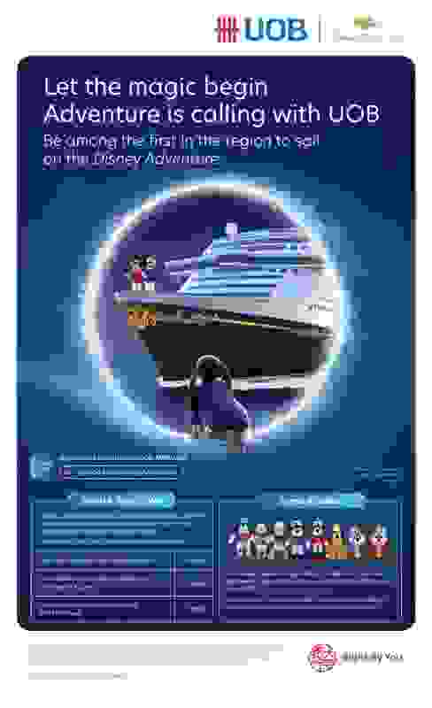 Với mục tiêu mở rộng các dịch vụ hàng đầu cho hơn tám triệu khách hàng bán lẻ trong khu vực, thỏa thuận hợp tác kéo dài ba năm này là minh chứng mới nhất cho cam kết của UOB trong việc mang đến cho khách hàng những trải nghiệm du lịch và giải trí khó quên, vượt xa các dịch vụ ngân hàng thông thường. Trong ba năm tới, chủ thẻ UOB sẽ được hưởng các quyền lợi đặc biệt khi đặt kỳ nghỉ trên du thuyền Disney Adventure thông qua các đối tác du lịch của UOB là UOB Travel Planners, Klook, Traveloka và Trip.com. Qua bốn đối tác này, ước tính có hơn 100.000 lượt truy vấn từ công chúng, bày tỏ sự quan tâm đến mùa ra khơi đầu tiên của Disney Adventure. Để khởi động sự hợp tác này, tất cả chủ thẻ UOB mua kỳ nghỉ trên du thuyền Disney Adventure thông qua các đối tác du lịch của UOB sẽ nhận được quà tặng là thú nhồi bông thủy thủ Chip và Dale phiên bản giới hạn[2]. Thông tin chi tiết về quyền lợi do mỗi đối tác du lịch cung cấp có trên trang web của các đối tác này.