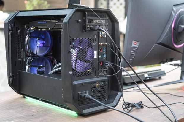 Nói đến card đồ họa thì Razer Cube hỗ trợ nhiều loại card với các kích cỡ khác nhau. Mình đã thử lắp ASUS Strix RX570 rồi Zotac GTX 1070, ASUS Strix GTX 1060 3 quạt và cả Gigabyte GTX 1070Ti thì đều gắn vừa mà không bị vướn víu với dây nhợ. Phần khe mở rộng có 3 slot, đối với những loại card cớ lớn thì chúng ta có thể tháo hết các tấm che ra để dành không gian cho các cổng trình xuất của card.