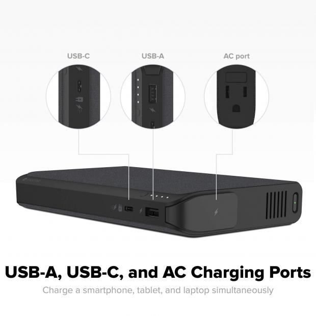 Bản thân Powerstation AC cũng là một cục pin dự phòng có dung lượng 22.000 mAh với hai cổng ra gồm USB-C và USB-A. Nếu bạn không cắm vào ổ điện thì cổng USB-C chỉ ra được 30W, còn cắm thì sẽ được tới 100W. Powerstation AC có hỗ trợ sạc ưu tiên 'pass-through' để khi cắm vào ổ điện thì nó sẽ ưu tiên sạc cho máy của bạn trước rồi mới sạc cho cục pin Mophie.