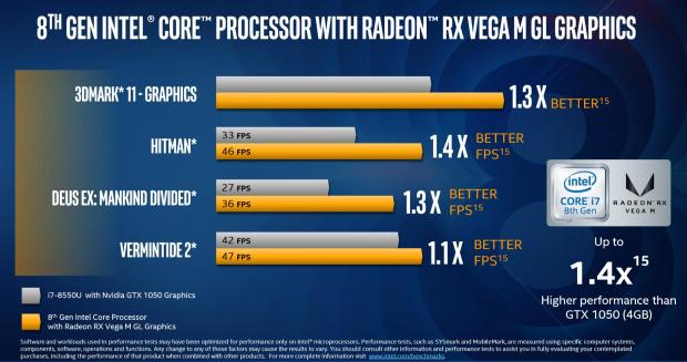 Phần CPU thì Intel vẫn sử dụng loại tiêu chuẩn của Core i thế hệ 8, với thiết lập 4 nhân/8 luồng với nhiều mức xung nhịp. Người dùng cũng sẽ có tuỳ chọn Core i7 và Core i5. Intel cũng có 2 tuỳ chọn GPU tích hợp là Vega M GH và Vega M GL. Xét về hiệu năng thì Vega GH sẽ mạnh hơn 1,13 lần so với GeForce 1060 Max-Q, còn Vega GL sẽ mạnh hơn khoảng 1,4 lần GTX 1050 tuỳ theo tác vụ.