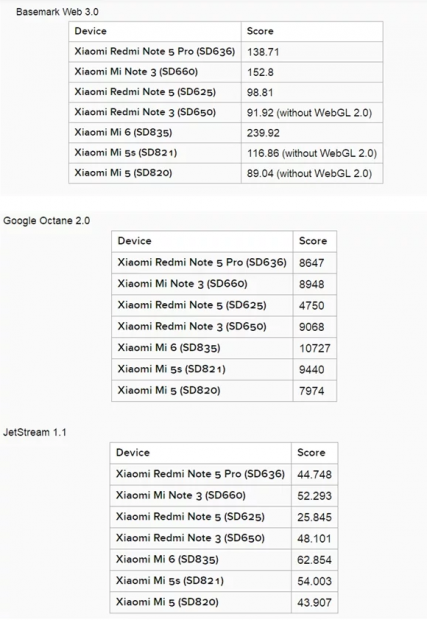 Tổng quan về điểm số hiệu năng của Redmi Note 5 Pro cũng cao hơn vi xử lý Snapdragon 650 của Redmi Note 3. Tuy vậy Snapdragon 660 vẫn giữ được ngôi vị là chip tầm trung mạnh mẽ nhất khi có số điểm cao hơn cả Snapdragon 636 và Snapdragon 820.