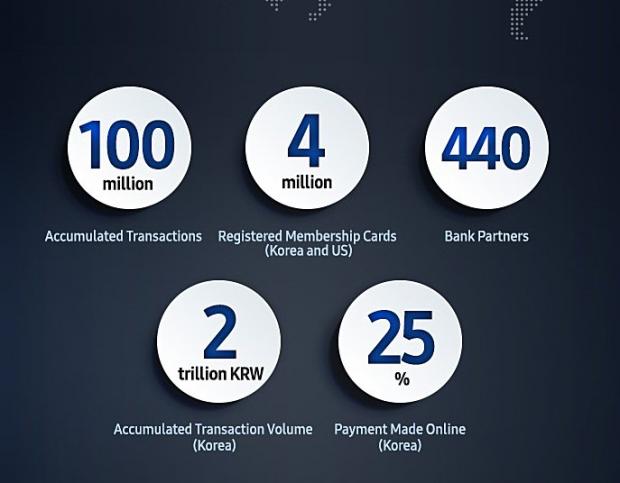 Nhân dịp kỷ niệm một năm Samsung Pay đi vào hoạt động, hãng đã công bố một vài số liệu đáng giá về dịch vụ thanh toán di động của họ ví dụ như đã xử lý được tới hơn 100 triệu giao dịch khác nhau trên toàn thế giới, có hơn 4 triệu thẻ thành viên tại Mỹ và Hàn Quốc, hỗ trợ tổng hơn 440+ ngân hàng và nếu tính riêng tại quê nhà Hàn Quốc, Samsung Pay đã thực hiện tới hơn 2 nghìn tỷ đồng Won, tương đương hơn 1,78 tỷ USD. Trong đó hơn 1/4 số này là các giao dịch online.