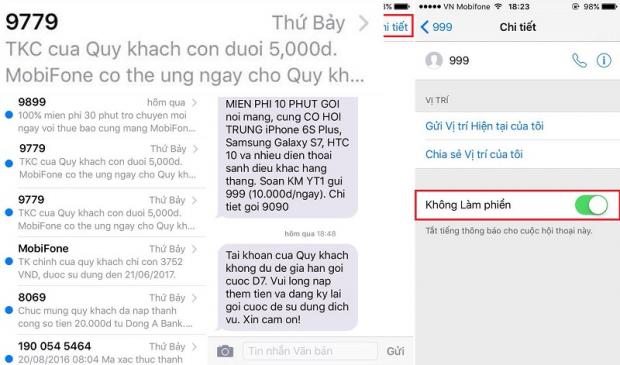 Đối với những tin nhắn quảng cáo nhà mạng có thể làm phiền đến bạn thì hãy tắt nó đi bằng cách vào phần: Tin nhắn > Chọn Tin nhắn muốn tắt > Chi tiết > Chọn Không làm phiền.