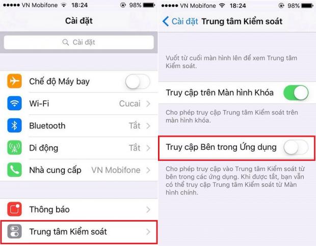 Tuy nhiên, để tránh vô tình mở nhầm Control Center khi đang xem phim, chơi game thì bạn cũng có thể tắt nó đi bằng cách vào phần: Cài đặt > Trung tâm kiểm soát > Tắt Truy cập bên trong ứng dụng.