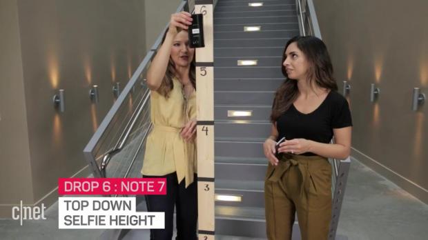 Note 7 may mắn hơn, dù thả ở cạnh bên nhưng máy lại đập lung xuống đất thay vì màn hình nên không bị ảnh hưởng gì cả. Chuyển sang độ cao selfie, máy cũng chỉ xước xước một ít ở phần viền, nơi cực kỳ dễ bị ảnh hưởng bởi va chạm. Ngay cả khi thả ở tư thế “chồng cây chuối”, không hiểu sao Note 7 lại tiếp tục may mắn “hạ cánh” bằng lưng chứ không phải bằng màn hình. Lúc này thì mặt lưng đã bị tàn phá nghiêm trọng, không còn vẻ bóng bẩy như ban đầu.
