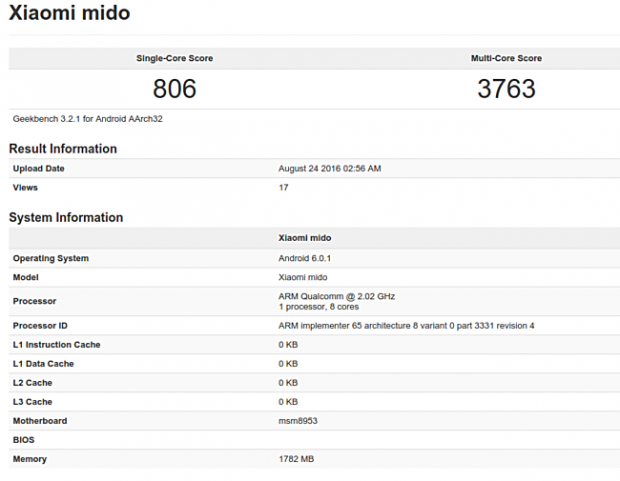Theo đó thì chiếc máy này sở hữu vi xử lý Qualcomm Snapdragon 625, đây là 1 chipset có tổng cộng 8 nhân xung nhịp 2.02 GHz, ngoài ra nó còn được trang bị 2GB RAM, chạy sẵn trên nền tảng Android 6.0.1 Marshmallow. Với một vài dự đoánn thì có thể đây là chiếc Xiaomi Redmi 4 đã được đồn đại là ra mắt cùng người anh em Redmi Note 4 hôm 25/8 nhưng đáng tiếc điều đấy lại không thành sự thật.