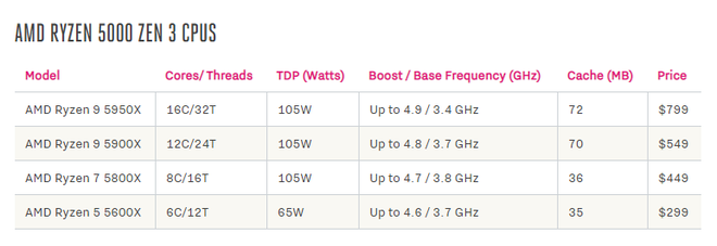 Thông số 4 mẫu CPU thuộc dòng Ryzen 5000. Nguồn: The Verge