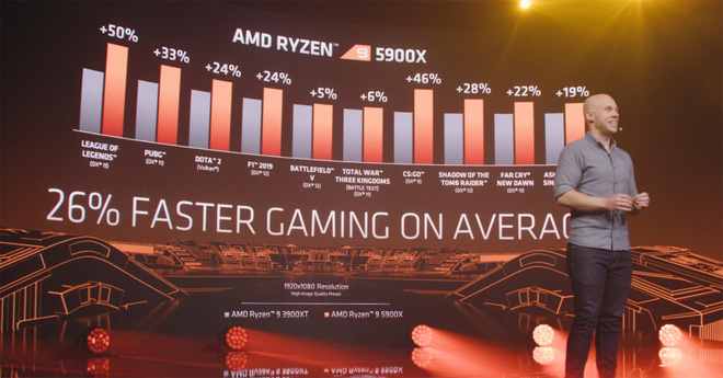 Kết quả benchmark đầy ấn tượng của Ryzen 9 5900X được AMD trình diễn trên sân khấu là minh chứng rõ ràng nhất. Mặc dù có cùng số nhân / luồng với Ryzen 9 3900XT, Ryzen 9 5900X mang tới hiệu năng chơi game nhanh hơn trung bình tới 26% ở độ phân giải 1080p so với người tiền nhiệm.