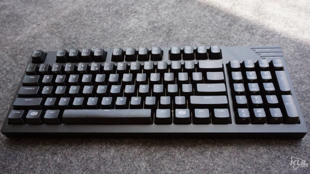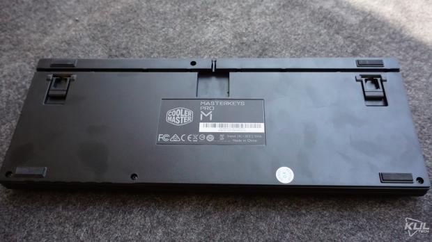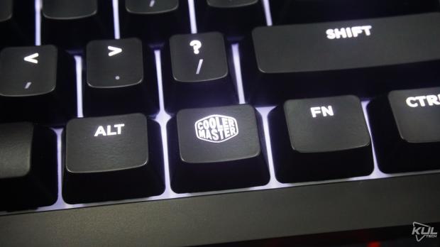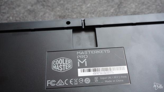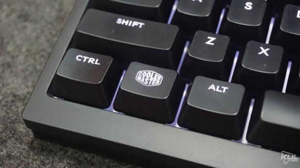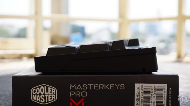 Mặt đáy của Pro M Khu vực cắm cáp Chân đế nâng độ caoKeycap trên Masterkeys Pro M sử dụng chất liệu ABS và được hoàn thiện tốt cho cảm giác nhấn khá chắc chắn. Các ký tự được khắc laser lên phím. Hai nút Windows được thay bằng hai logo Cooler Master để tạo sự khác biệt.