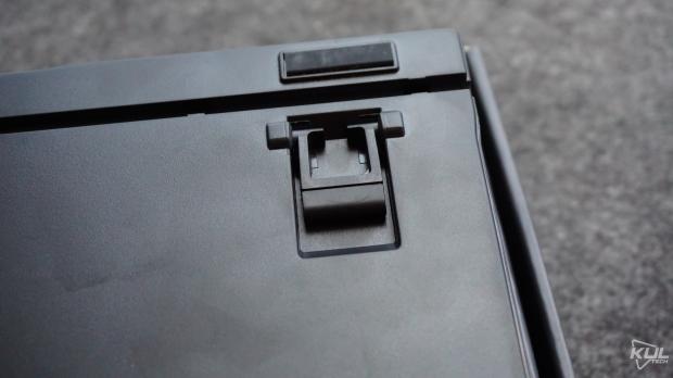 Đường cách điệu bên hông Và phía trước bàn phímDưới đáy chúng ta có bốn chân feet giúp bàn phím bám chắc trên mặt bàn . Ngoài ra, Pro M cũng có hai chân đế để nâng độ cao, tuy nhiên người viết nhận thấy rằng chiếc bàn phím này đã đạt độ cao vừa phải để gõ.