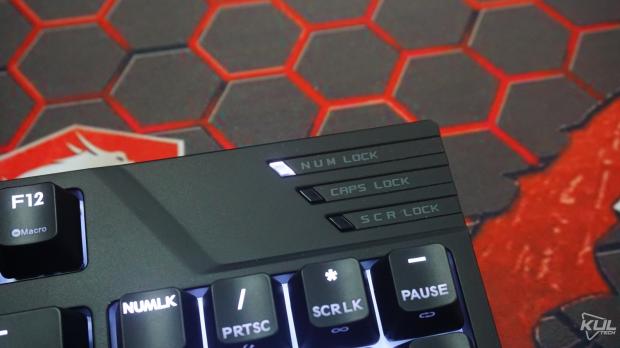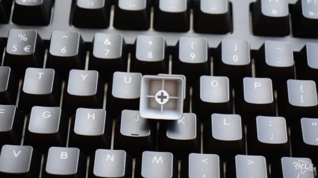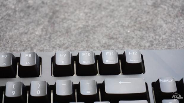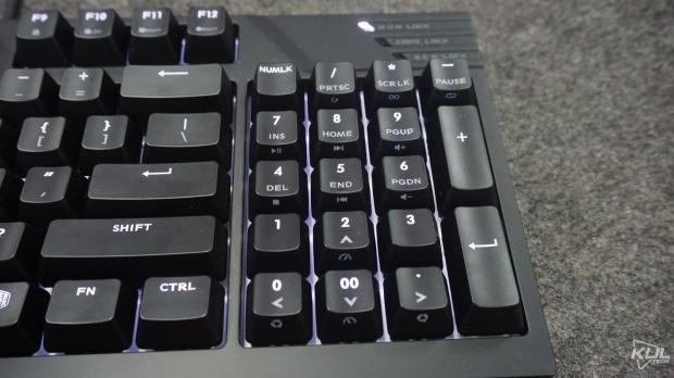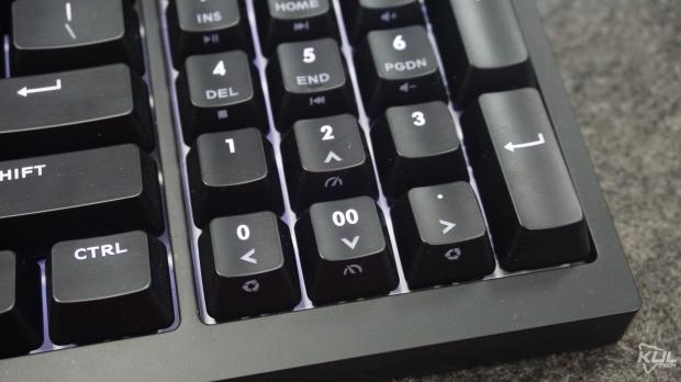 Đầu tiên ở mặt trước chúng ta có một chiếc bàn phím lai... với layout 'lạ' như đã được đề cập ở trên. Các phím điều chỉnh trang (Insert, Home, v.v.) và điều hướng được tích hợp vào Numpad nên trông hơi rối mắt. Chưa kể các phím đa phương tiện, điều chỉnh tính năng cho Pro M cũng được đặt ở cụm Numpad, khiến nơi này trở thành ma trận nút.