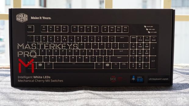Hộp của Masterkeys Pro M với tông màu chủ đạo là đen nhạt để làm nổi bật hình ảnh sản phẩm cùng dãy đèn LED sáng lóa ở mặt trước. Chúng ta còn có một số thông tin khác như thông tin về switch và layout của bàn phím là US.