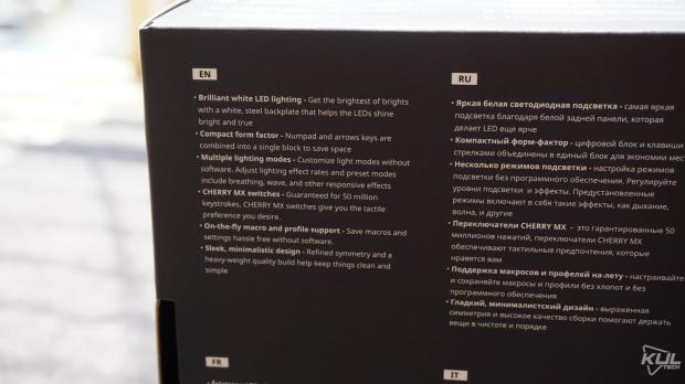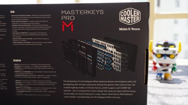 Mặt trước của hộp sản phẩm Phiên bản Kul đang có sử dụng Blue switchMặt sau ghi chú một số tính năng của sản phẩm như LED siêu sáng, thiết kế tiết kiệm không gian, nhiều chế độ LED, v.v. Ngoài ra, Cooler Master cũng trưng ra hình ảnh kết cấu của Pro M, đáng chú ý có một tấm kim loại đặt giữa mạch và switch.