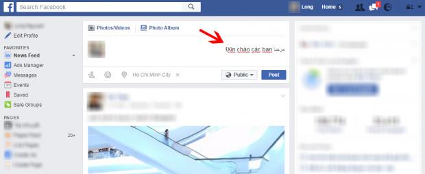 Sau đó bạn copy cụm từ này vào Facebook, con trỏ sẽ tự nhảy sang phải. Bạn có thể xóa bớt các ký tự Ả-rập, miễn chỉ cần giữ lại một chữ, rồi sau đó gõ bất kỳ nội dung nào tùy thích.