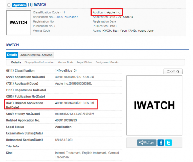 Ở thế hệ smartwatch thứ hai, dự kiến sẽ được Apple ra mắt vào ngày 7/9 sắp tới cùng với iPhone 7, có vẻ như Apple sẽ sử dụng cái tên “iWatch” cho thiết bị này. Vào tuần trước, một đơn đăng ký thương hiệu “iWatch” đã được duyệt tại Châu Á, dựa theo thông tin trên tài liệu rò rỉ thì đơn này được nộp vào ngày 3/6/2013.