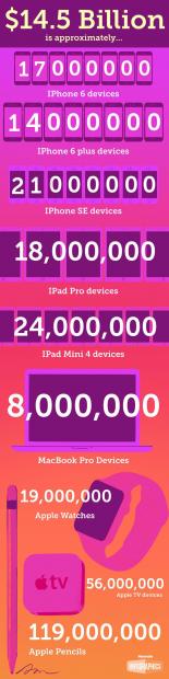 Tạm thời hãy bỏ qua chuyện bên nào đúng bên nào sao vì sự việc chưa ngã ngũ, Kul Tech xin gửi đến bạn đọc hình ảnh infographic bên dưới, cho thấy số tiền khủng 14,5 tỳ USD nợ thuế của Apple nếu quy đổi ra sản phẩm của chính họ thì nhiều đến mức nào: