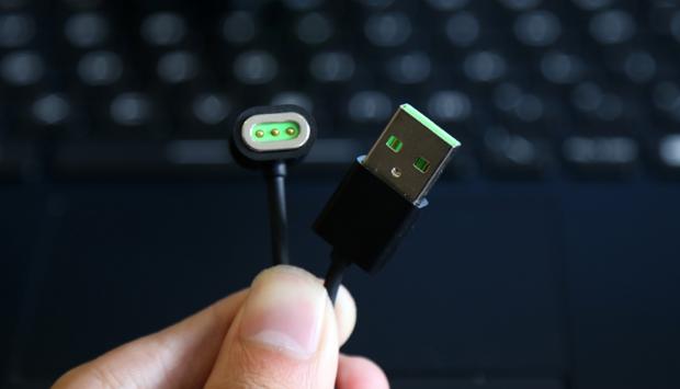 Điểm đặc biệt hầu như chỉ xuất hiện trên các sản phẩm Razer chính là dây cáp kết nối. Với Nabu Watch, hãng không sử dụng cổng microUSB thông thường hay dùng đế sạc rời mà lại sử dụng kết nối 3 chân trông rất “dị”. Đồng thời, xung quanh được bọc một thanh kim loại có nam châm, nhìn rất giống cổng sạc MagSafe trên laptop MacBook.