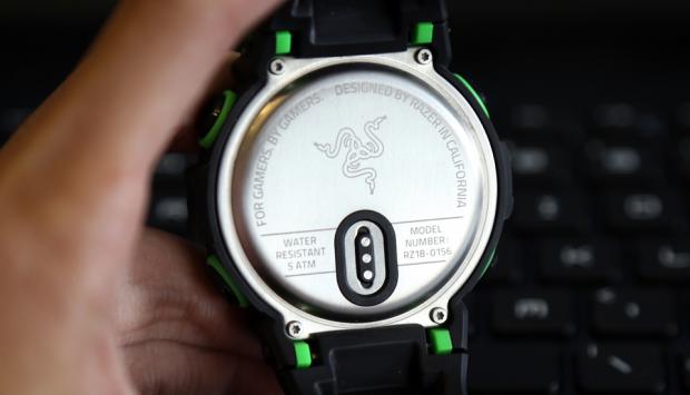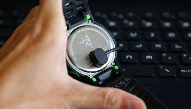 Mặt dưới của Nabu Watch là một miếng kim loại bóng bẩy với 4 con ốc chấu dạng ngôi sao. Bề mặt in rất nhiều chi tiết như logo hãng, khả năng chống nước 5 ATM, mã số sản phẩm và đặc hơn là dòng chữ “For gamers, by gamers” để nhấn mạnh đối tượng khách hàng chính của Razer. Cuối cùng là cổng sạc 3 chân được bọc viền cao su xung quanh.