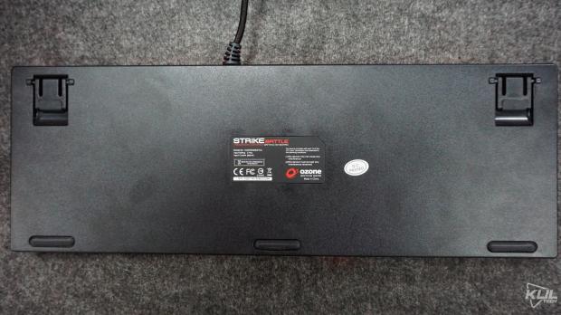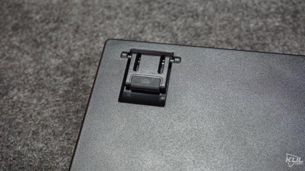 Ở mặt đáy, chúng ta có bốn feet khá dày được làm bo tròn và hai chân đế để nâng độ cao của bàn phím.