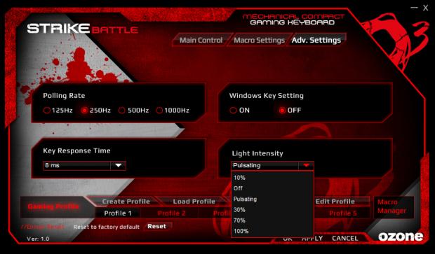 Tuy nhiên sản phẩm của Ozone lại không có nhiều hiệu ứng ánh sángViệc điều chỉnh đèn và hiệu ứng trên Strike Battle khá đơn giản. Bạn có thể nhấn nút có ký hiệu Ozone và nút Scroll để tuần tự thay đổi các hiệu ứng cũng như độ sáng (chủ yếu là độ sáng). Hoặc bạn cũng có thể tải driver của Strike Battle về để sử dụng được nhiều tính năng hơn như hiệu chỉnh polling rate, thời gian phản hồi, chỉnh macro phím, chỉnh các profile khác nhau cho từng game, v.v.