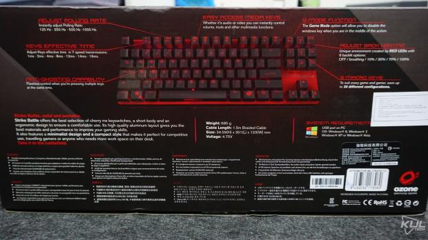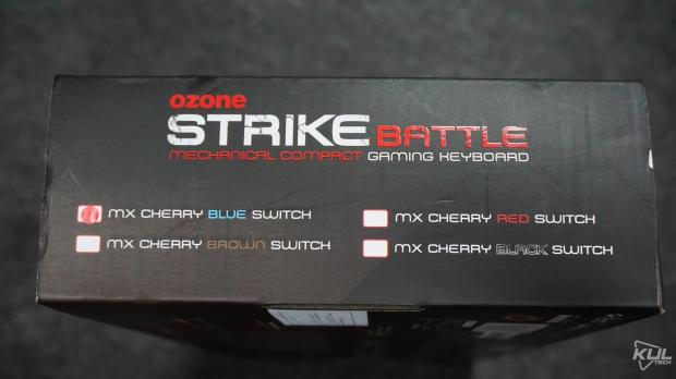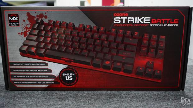 Hộp của Strike Battle được Ozone đầu tư khá nhiều Một số tính năng nổi bật trên Strike Battle: phần ốp phía trên bằng nhôm, có đèn, v.v.Mặt sau vẫn là hình ảnh của Strike Battle nhưng lần này Ozone liệt kê nhiều tính năng trên sản phẩm của mình hơn, như: Điều chỉnh polling rate, phím đa phương tiện, chế độ chơi game (khóa nút Windows), v.v.