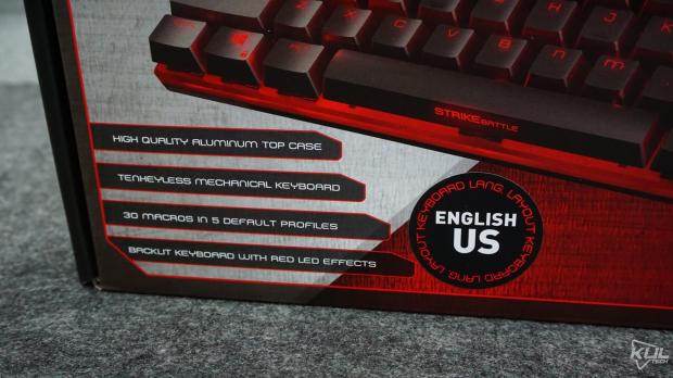 Mặt sau hộp chi chít thông tin về sản phẩm Phiên bản Kul có trong tay sử dụng switch Blue của Cherry MXStrike Battle thuộc dạng bàn phím tenkeyless cho nên cụm phím Numpad sẽ bị lược bỏ hoàn toàn (dĩ nhiên rồi). Điểm đáng chú ý trên Strike Battle chính là thiết kế phần ốp trên bằng kim loại mát lạnh chỉ 'ôm' lấy bản mạch, chừa switcth và keycap lồi lên hẳn.