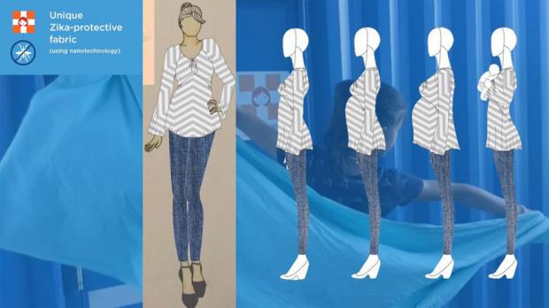 Được phát triển bởi Maternova, cộng đồng phát minh hướng đến hỗ trợ phụ nữ mang thai, dòng sản phẩm quần áo này chứa chất đuổi công trùng, với mục tiêu giúp các bà bầu phòng ngừa virus Zika lây truyền từ muỗi, nỗi khiếp sợ gần đây với nguy cơ gây bệnh teo não cho trẻ sơ sinh.