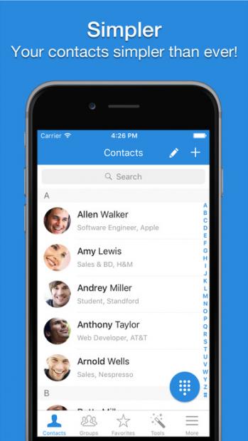 Ứng dụng này có tính năng dọn dẹp sổ danh bạ, gộp các contact trùng. Bạn có thể tạo một nhóm các số liên lạc để chia sẻ với bạn bè và gia đình. Ngoài ra còn có tính năng sao lưu toàn bộ danh bạ chỉ với một nút bấm.