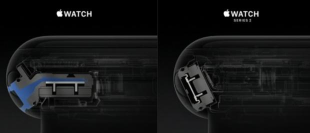 Trong Apple Watch đời đầu, loa là bộ phận duy nhất mà nước có thể vào trong được và dây ảnh hưởng đến các linh kiện ở bên trong, tuy nhiên với thế hệ thứ 2 Apple đã trang bị cho nó khả năng tự đẩy nước ra qua.