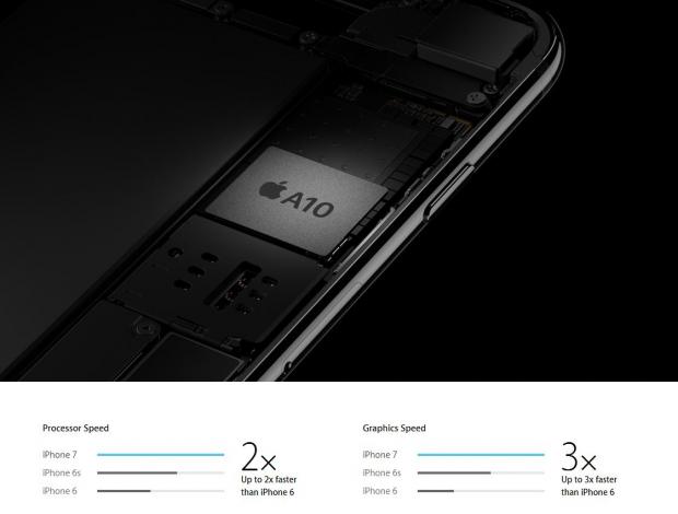 Apple cũng cho biết chip xử lý đồ họa mới (GPU) bên trên iPhone 7 cho hiệu năng xử lý hình ảnh tốt hơn 50% so với A9 và cao gấp… 240 lần chiếc iPhone đầu tiên. Và nhờ kiến trúc kết hợp nhân CPU tiết kiệm điện, pin của iPhone 7 có thể kéo dài lâu hơn 2 tiếng so với iPhone 6s và iPhone 7 Plus hơn 1 tiếng so với 6s Plus.