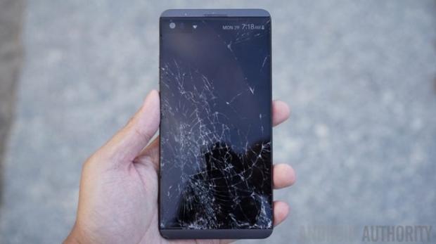 Lớp kính bảo vệ bên ngoài màn hình LG V20 bị vỡ sau khi rơi ở độ cao 2,1 m.