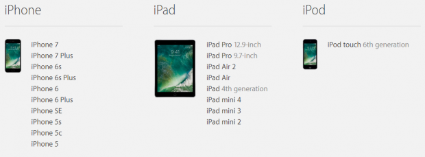 Danh sách các thiết bị có thể nâng cấp lên iOS 10 (riêng iPhone 7 và iPhone 7 Plus sẽ được cài sẵn iOS 10 khi bán ra):