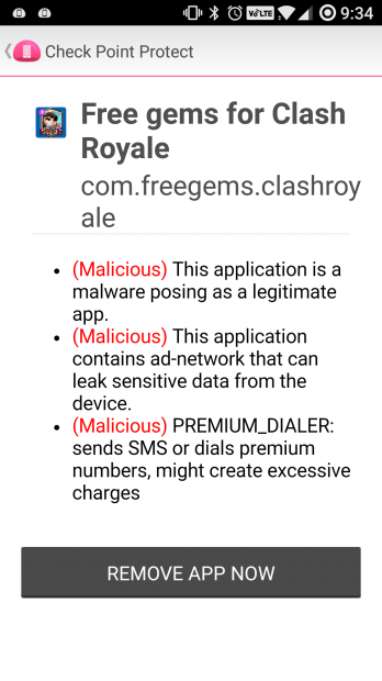 Cảnh báo từ ứng dụng Check Point Protect trên AndroidCheck Point đã báo đầy đủ thông tin đến Google về phần mềm nguy hiểm này.