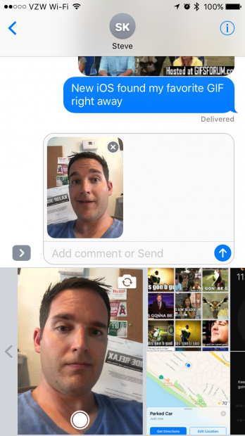 Chụp ảnh ngay trong tin nhắn: Bấm biểu tượng camera và bạn có thể chọn ảnh có sẵn hoặc chụp ảnh selfie rồi gửi mà không cần mở ứng dụng Camera. Sau khi chọn ảnh bạn có thể chọn để vẽ vời hay thêm hiệu ứng cho chúng.