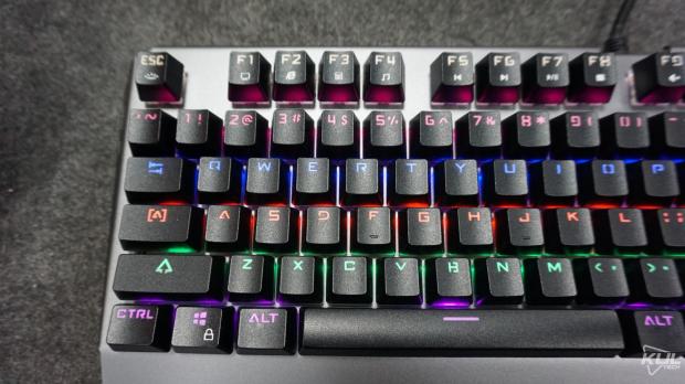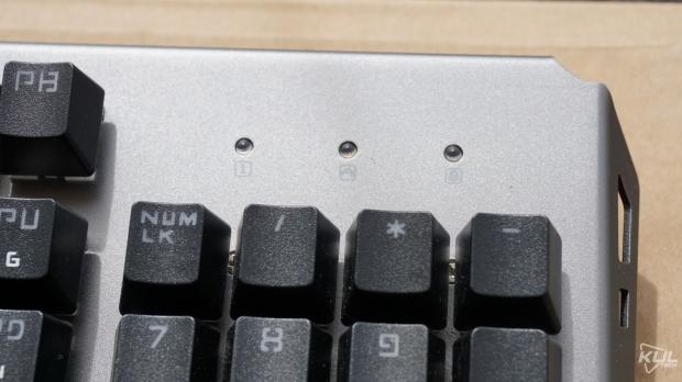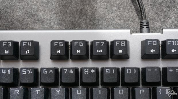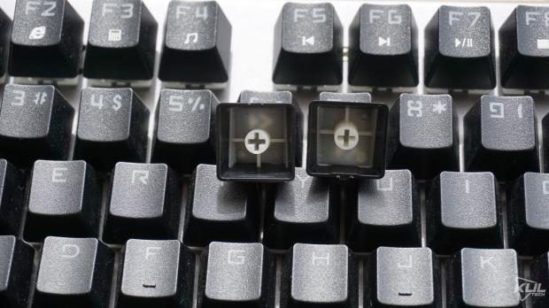 Switch lộ hẳn ra ngoàiMột điểm mà ngay đến các hãng nổi tiếng cũng ít khi làm đó là trang bị keycap doubleshot. Keycap doubleshot Tuy lớp thứ hai trong keycap của GT-03K hơi mỏng nhưng dù sao vẫn là một lợi thế của chiếc bàn phím này. Một điểm đáng tiếc là các ký tự phụ lại được in lên trông chưa được thẩm mỹ.