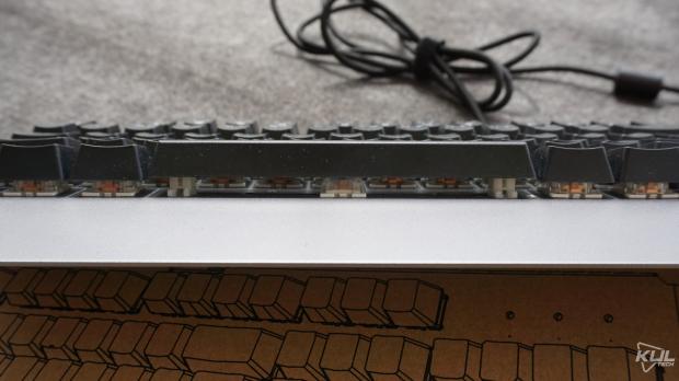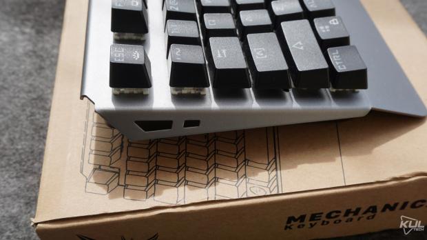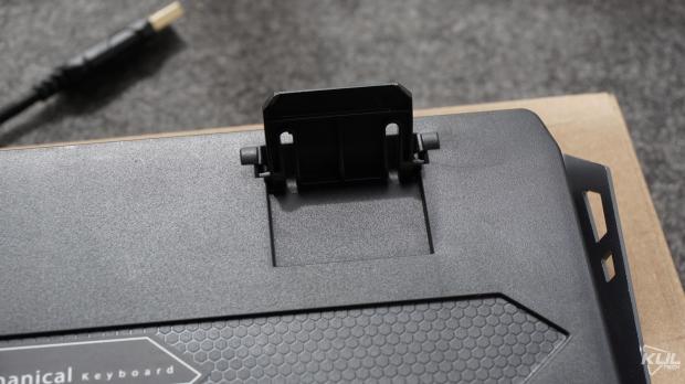 Tuy nhiên mặt dưới chỉ có hai feet cao su Chân đế nâng độ cao không có bọc cao suNgoài ra, các phím trên GT-03K được thiết kế theo dạng lộ switch và keycap lên trên để ánh sáng tỏa ra đẹp hơn. Nhược điểm thì sẽ mau bám bụi nhưng vệ sinh cũng dễ dàng.