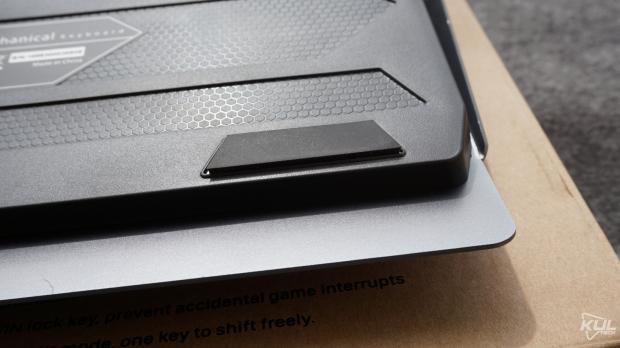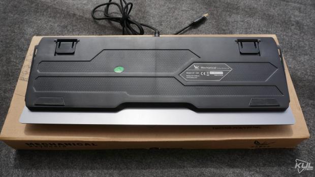 Mặt dưới cách điệu của GT-03KMặt dưới được Zadez trau chuốt trông khá hiện đại tuy nhiên điều đáng nói chiếc bàn phím này chỉ có hai chân feet bằng cao su thay vì bốn như thông thường. Ngoài ra, chúng ta vẫn có hai chân đế nâng độ cao. Tuy nhiên, khi bạn dựng chân lên thì khả năng bám trên mặt bàn của GT-03K giảm đi đáng kể.