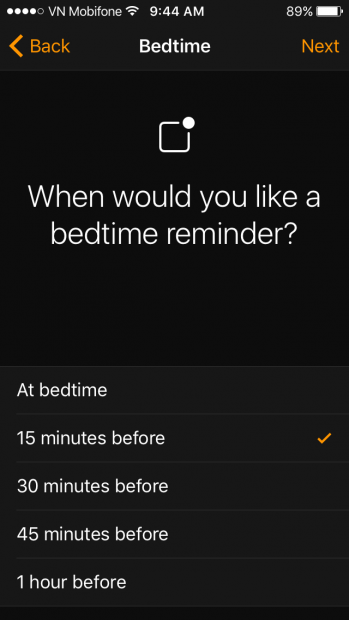 Màn hình giới thiệu tính năng Bedtime, bấm vào 'Get Started' để bắt đầu thiết lập Đầu tiên bạn chọn thời gian cần thức dậy mỗi sáng Tiếp theo là những ngày cần tắt báo thức, ở đây người viết chọn 2 ngày cuối tuần Tiếp đến máy hỏi bạn muốn ngủ bao nhiêu tiếng một đêm Sau đó bạn có thể thiết lập mốc thời gian để điện thoại thông báo 'đã đến giờ đi ngủ' Sau đó là yêu cầu chọn nhạc chuông báo thức. Tuy nhiên, không hiểu sao ở đây ta không thể nghe được nhạc mẫu khi chọn Cuối cùng là màn hình giới thiệu tính năng Sleep Tracker giúp ghi nhận thông tin giấc ngủ, sẽ hoạt động tốt nhất nếu người dùng có một thiết bị theo dõi sức khỏe Màn hình chính của tính năng Bedtime, thể hiện thời gian ngủ mà người dùng đã chọn. Bạn có thể chỉnh lại tùy thích những lựa chọn bên trên trong mục 'Options'Nguyên Khang