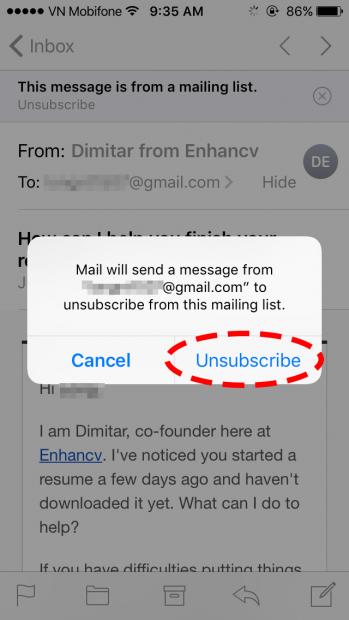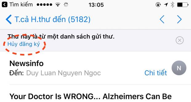 Với ứng dụng Mail trong iOS 10, Apple đã biến việc này trở thành rất tiện lợi. Mail sẽ quét các thư trong hộp thư nhận (Inbox) của bạn và tìm những mail nào có tính năng Unsubscribe. Nếu có, nó sẽ hiển thị ngay trên đầu thư để người dùng bấm luôn, không phải mất công dò tìm.