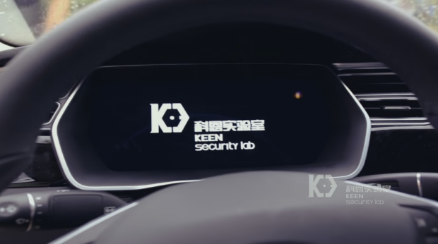 Logo của Keen Security Lab hiện trên màn hình đa thông tin trong xe ...và cả màn hình cảm ứng trung tâmDĩ nhiên để hack được chiếc xe cần một số số điều kiện. Đó là người tài xế cần phải truy cập vào một hotspot WiFi độc từ máy tính trong xe, và sau đó mở trình duyệt web. Nhờ vậy, nhóm hacker mới chiếm được quyền điều khiển máy tính trên xe, từ đó điều khiển luôn cả chiếc xe.
