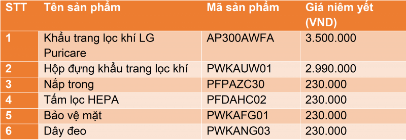 Tại Việt Nam, giá niêm yết khẩu trang lọc khí LG Puricare và các phụ kiện như sau: