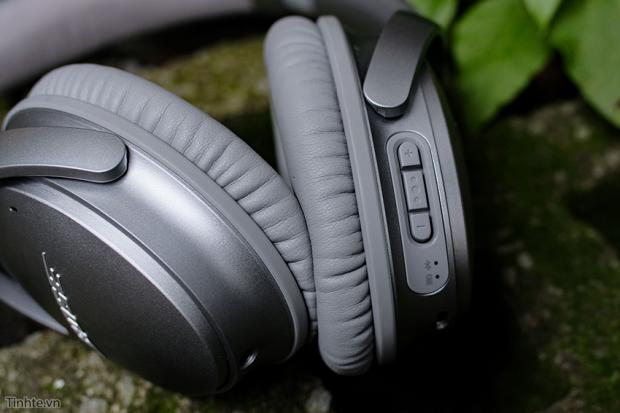Ngay sát cụm nút điều khiển là 2 đèn báo kết nối và đèn nguồn. Đèn xanh lá thì còn pin, đỏ khi hết pin. Sát xuống cạnh bên dưới nữa là lỗ cắm microUSB để sạc cho tai nghe. Trên trung tâm earcup là công tắc mở nguồn cho tai, nếu nhấn giữ về một phía là sẽ chuyển tai sang chế độ chờ kết nối với nguồn phát nhạc. Ở phía earcup đối diện chúng ta có lỗ cắm 2.5. Tất nhiên, đi kèm theo tai là một sợi cáp 2.5mm - 3.5mm để kết nối trực tiếp với thiết bị. Khi hoạt động ở chế độ này, tai sẽ tự hiểu và tắt kết nối bluetooth để tiết kiệm pin. Tất nhiên khi xài có dây thì chúng ta vẫn có thể dùng được QC 35 ngay khi nó hết pin, tuy nhiên chức năng chống ồn chủ động sẽ không xài được.