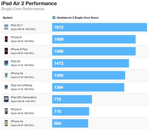iPad Air 2 cũng đạt điểm số cao khi thử nghiệm xử lý bằng một nhân. Tốc độ của sản phẩm tăng 13% so với chip A8 trên bộ đôi iPhone 6 và tăng 23% so với iPad Air.