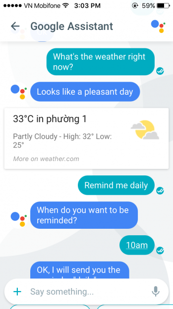 Để làm, bạn cần chat trực tiếp với Google Assistant và yêu cầu nó làm một điều gì đó. Chẳng hạn người viết hỏi nó tình hình thời tiết hiện tại. Sau khi có kết quả, tôi yêu cầu nó nhắc lại hàng ngày. Google Assistant hỏi tôi lúc nào thì muốn nhận thông tin này. Sau khi chọn xong, tôi đã được Assistant gửi dự báo thời tiết tự động vào mốc thời gian đã chọn mỗi ngày.