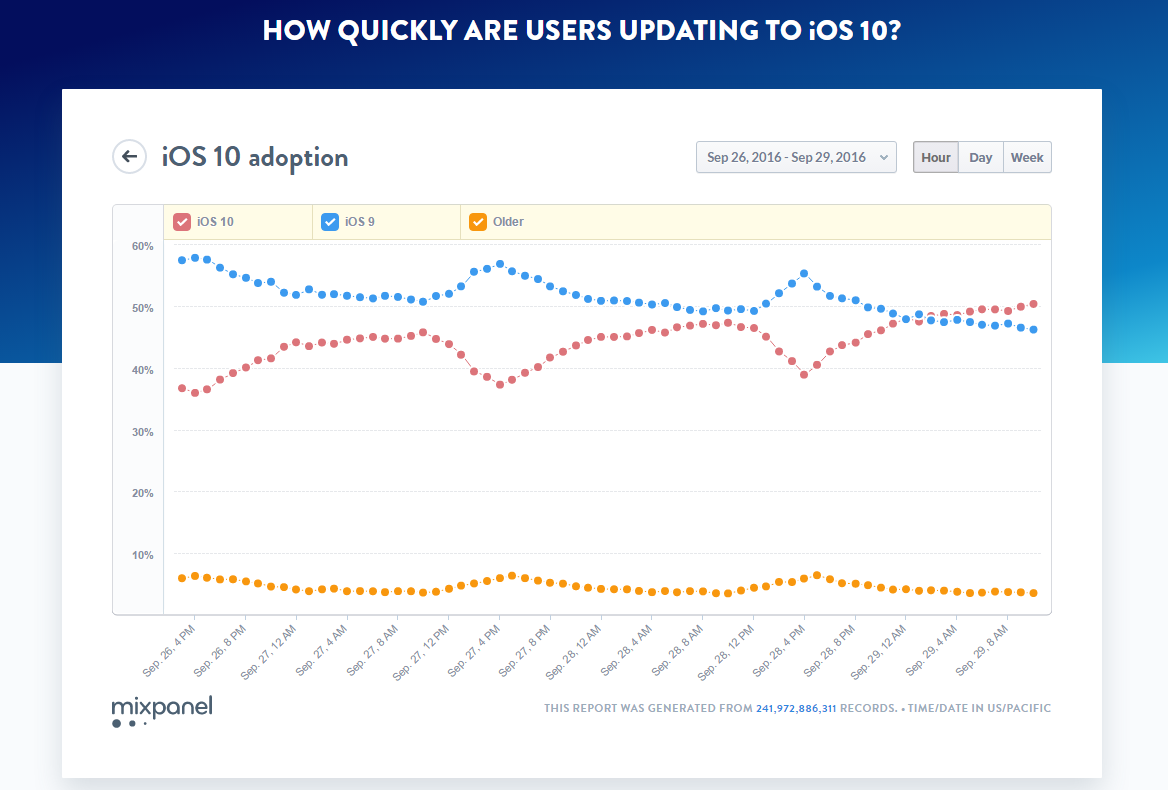 Theo thống kê mới nhất từ Mixpanel tính đến thời điểm bài viết, hơn 50% thiết bị Apple đã được cập nhật lên phiên bản iOS mới nhất này. Điều này đã chứng tỏ được sức hút cực kỳ mãnh liệt của các phiên bản nâng cấp đối với người dùng. Thậm chí có những người bỏ ngoài tai nhiều cảnh báo về hiệu năng sụt giảm, giật lag trên các thiết bị cũ như iPhone 5, 5c để khoác cho đứa con cưng bộ cánh iOS 10 cho bằng bạn bằng bè.