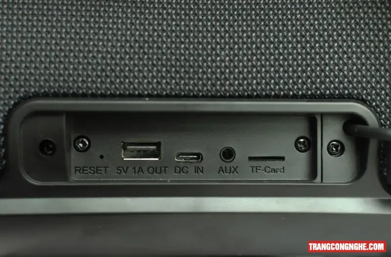 Đằng sau Tronsmart Bang là các cổng kết nối của loa, được bảo vệ bởi một nút cao su rất dày. Tronsmart Bang đạt chuẩn kháng nước IPX6, nên bạn có thể yên tâm nghe nhạc khi đặt cạnh bể bơi mà không quá lo lắng nếu nước bắn vào. Tại đây, chúng ta có một cổng USB-A để nghe nhạc qua ổ flash hoặc sạc pin – Tronsmart Bang kiêm cả vai trò của một viên pin dự phòng, cổng USB-C để sạc, jack 3.5mm AUX và khe thẻ TF Card.