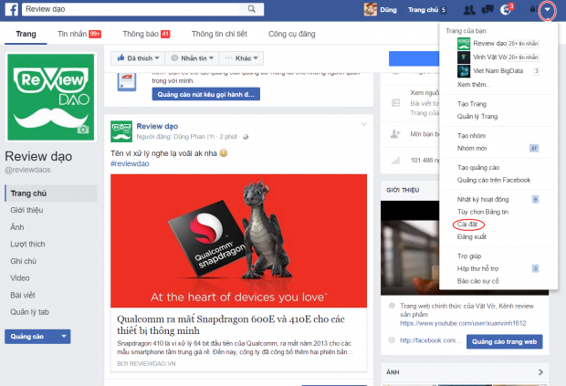Bước 1: Ngoài giao diện chính tài khoản Facebook của bạn, hãy bấm biểu tượng tam giác nhỏ góc trên bên phải và chọn Cài đặt (Settings).